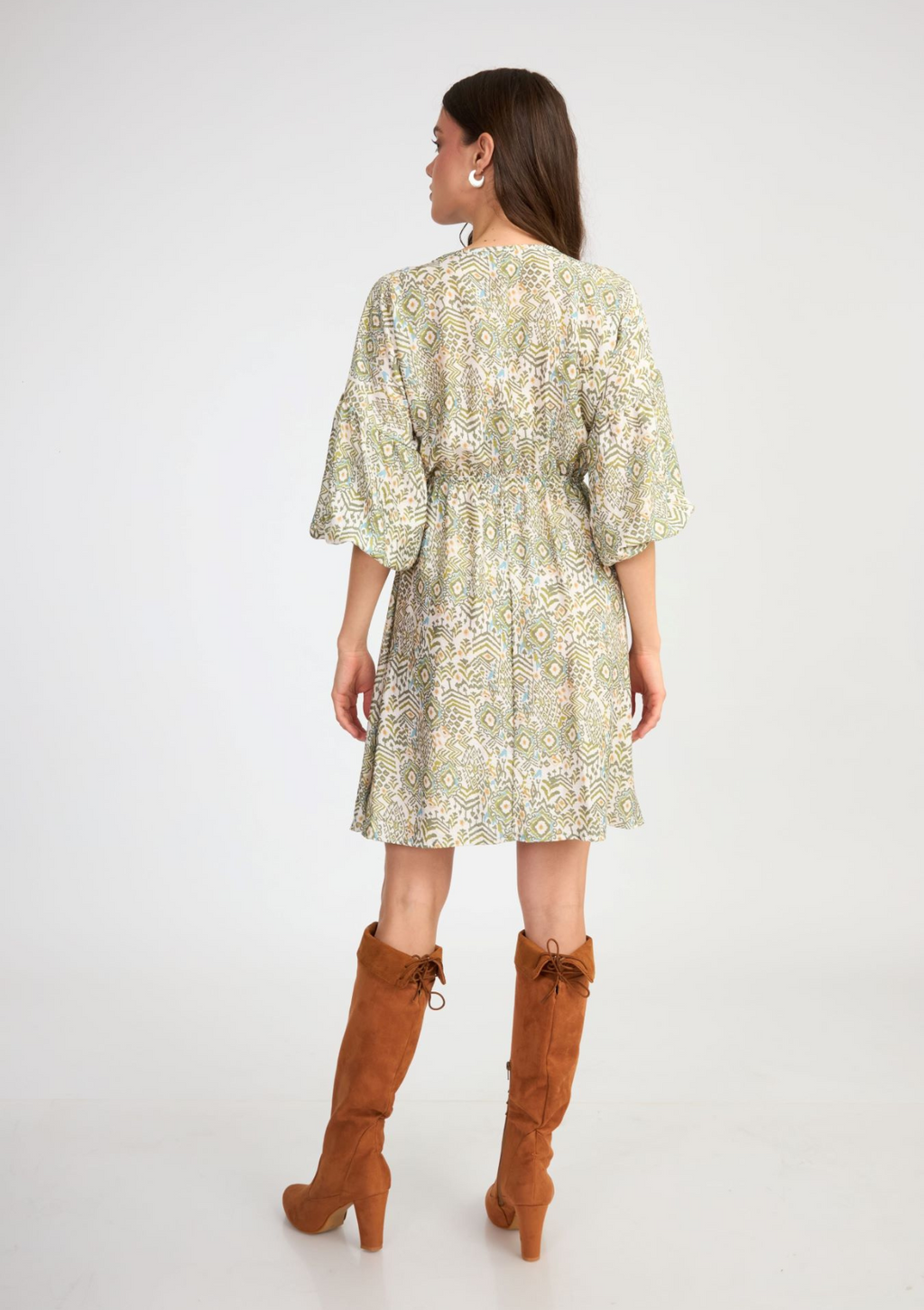 Vestido corto de estilo bohemio con un corte suelto y cómodo. Presenta un escote en "V" pronunciado con detalle de pequeño lazo en el centro del busto. Las mangas son tres cuartos y abullonadas, lo que añade un toque relajado y romántico. El vestido tiene un estampado geométrico en tonos verdes, beige y blancos, creando un diseño visualmente interesante y armonioso. La falda tiene un ligero vuelo, lo que proporciona movimiento y frescura. La modelo lo combina con unas botas altas en color camel, lo que acentúa el estilo casual y otoñal del conjunto.