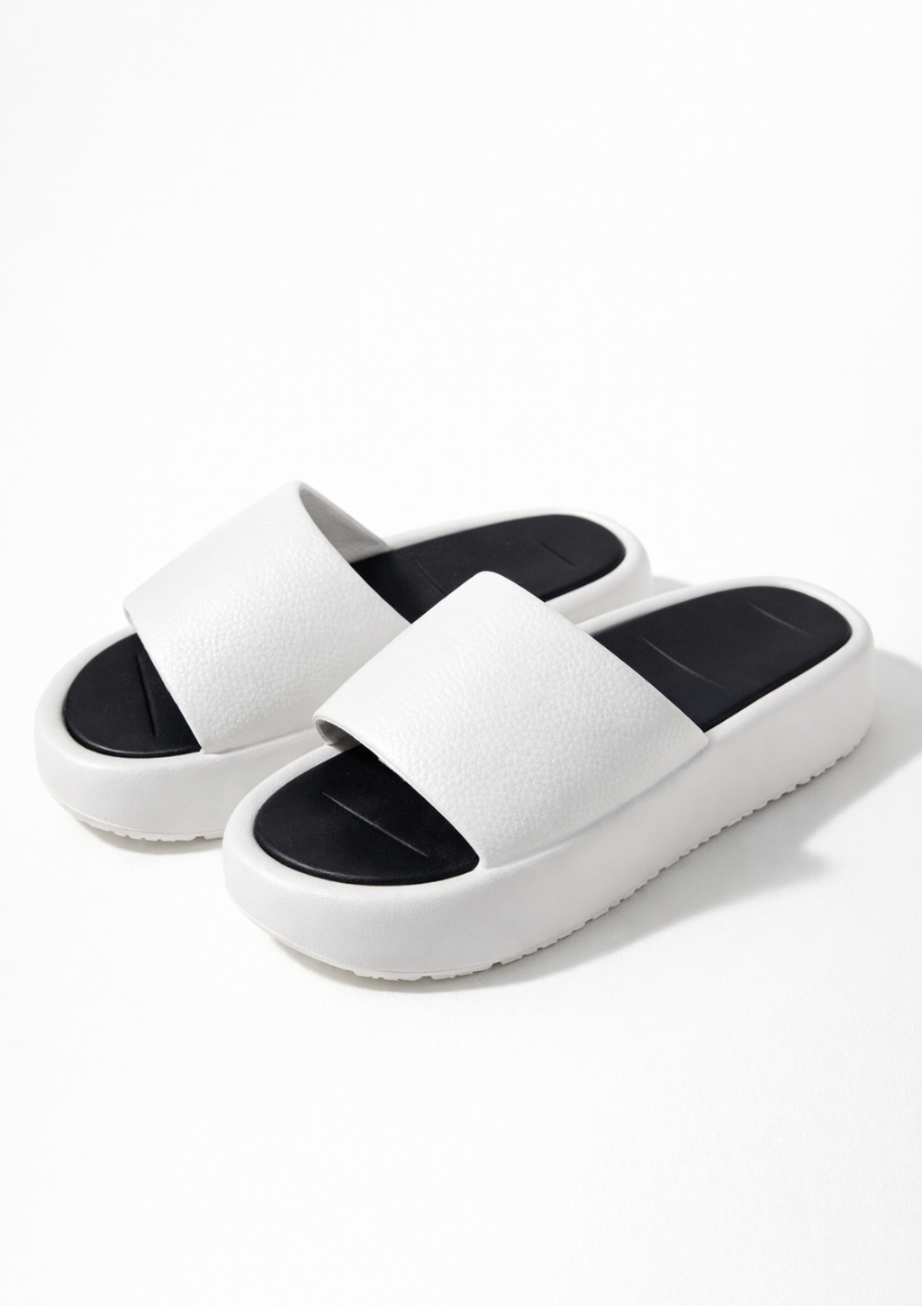 Un diseño limpio, fresco y moderno perfecto para la temporada de verano. Estas sandalias destacan por su tira ancha acolchada y su cómoda plataforma que brinda estabilidad y suavidad al caminar.
