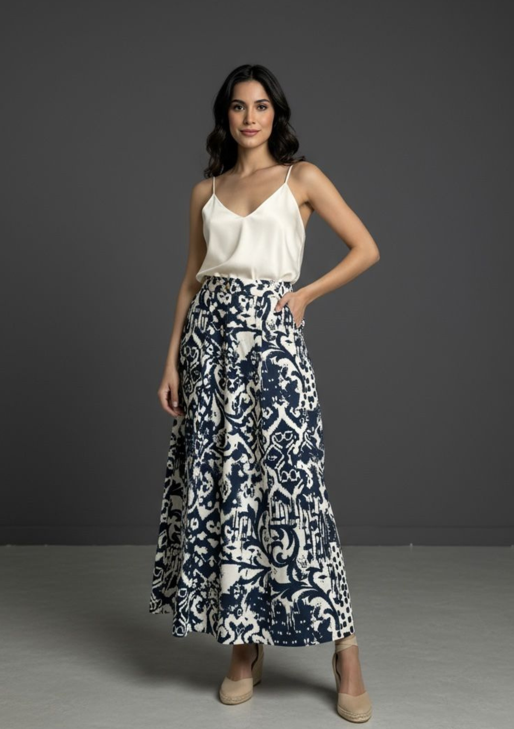 Eleva tu estilo con esta falda larga en corte A, diseñada para realzar la silueta con un movimiento fluido y elegante. Confeccionada en lino ligero, ofrece frescura y comodidad durante todo el día. Su estampado print azul aporta un toque moderno y femenino, ideal para looks versátiles.