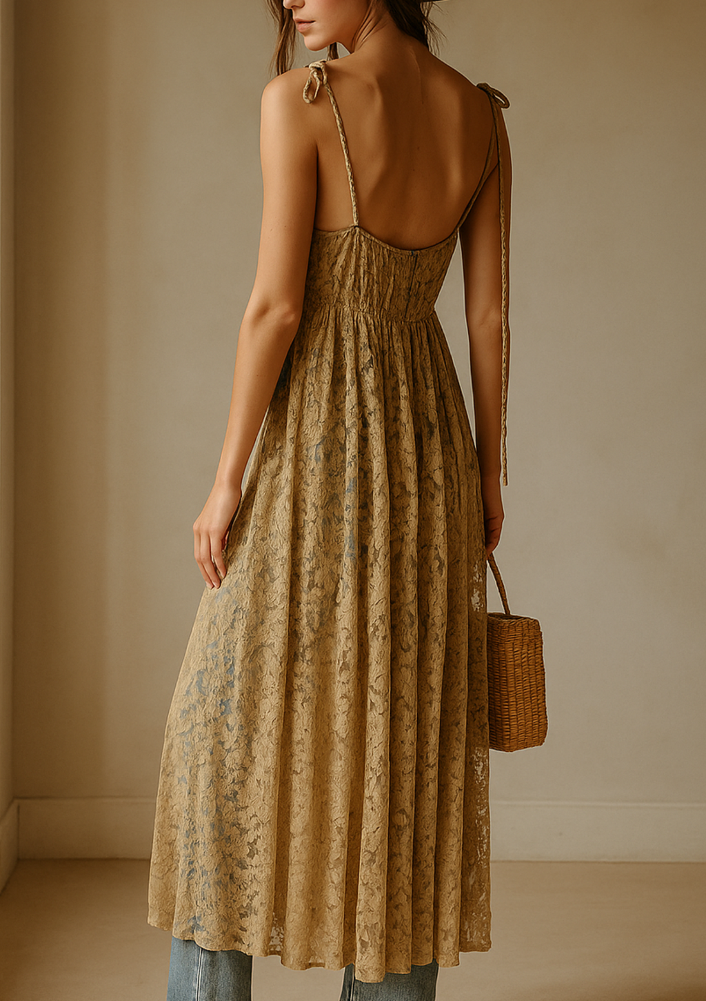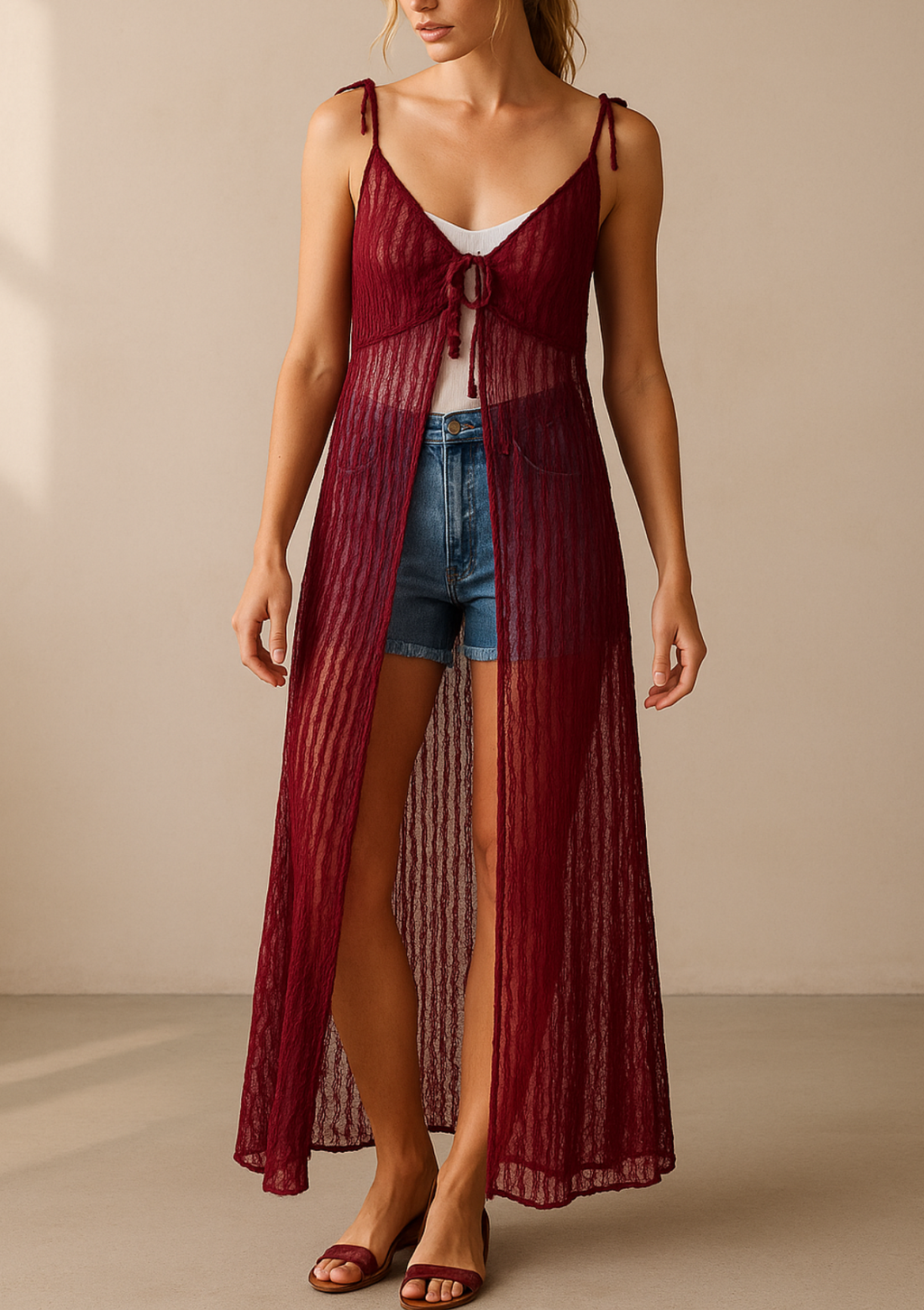 Añade un toque delicado y sensual a tu outfit con nuestra capa maxi de encaje calado. Su diseño largo, abierto y transparente, con dos lazos ajustables en el pecho, ofrece un estilo bohemio y fluido. Los tirantes finos para anudar añaden un detalle coqueto.