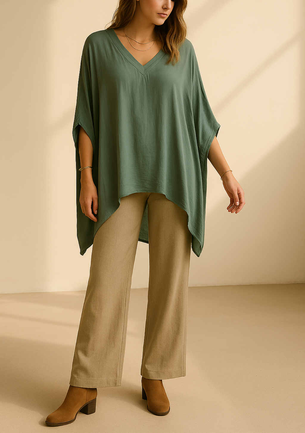Añade un toque de lujo a tu armario con nuestra blusa kaftán. Su diseño de corte murciélago y silueta oversize ofrece una caída fluida, un escote en V favorecedor y máxima comodidad.