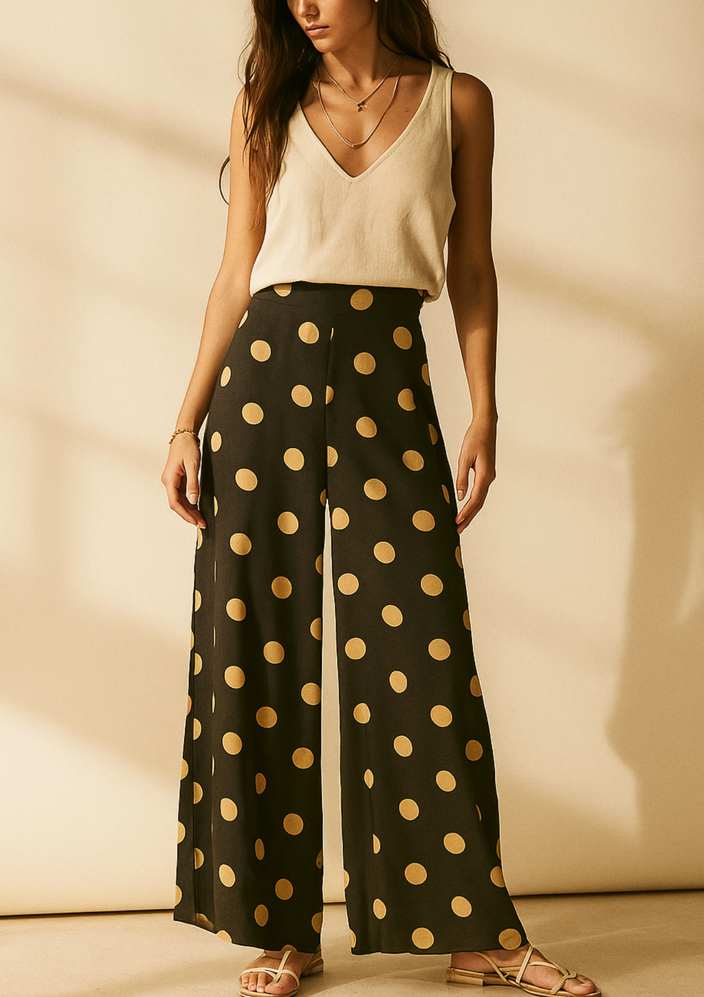 Añade un toque audaz a tu look con nuestro pantalón palazo de chalis. Su vibrante estampado de lunares grandes y diseño de corte ancho (palazo) ofrece una caída fluida. Cuenta con bolsillos laterales y elástico en la parte trasera de la cintura para un ajuste cómodo y perfecto.