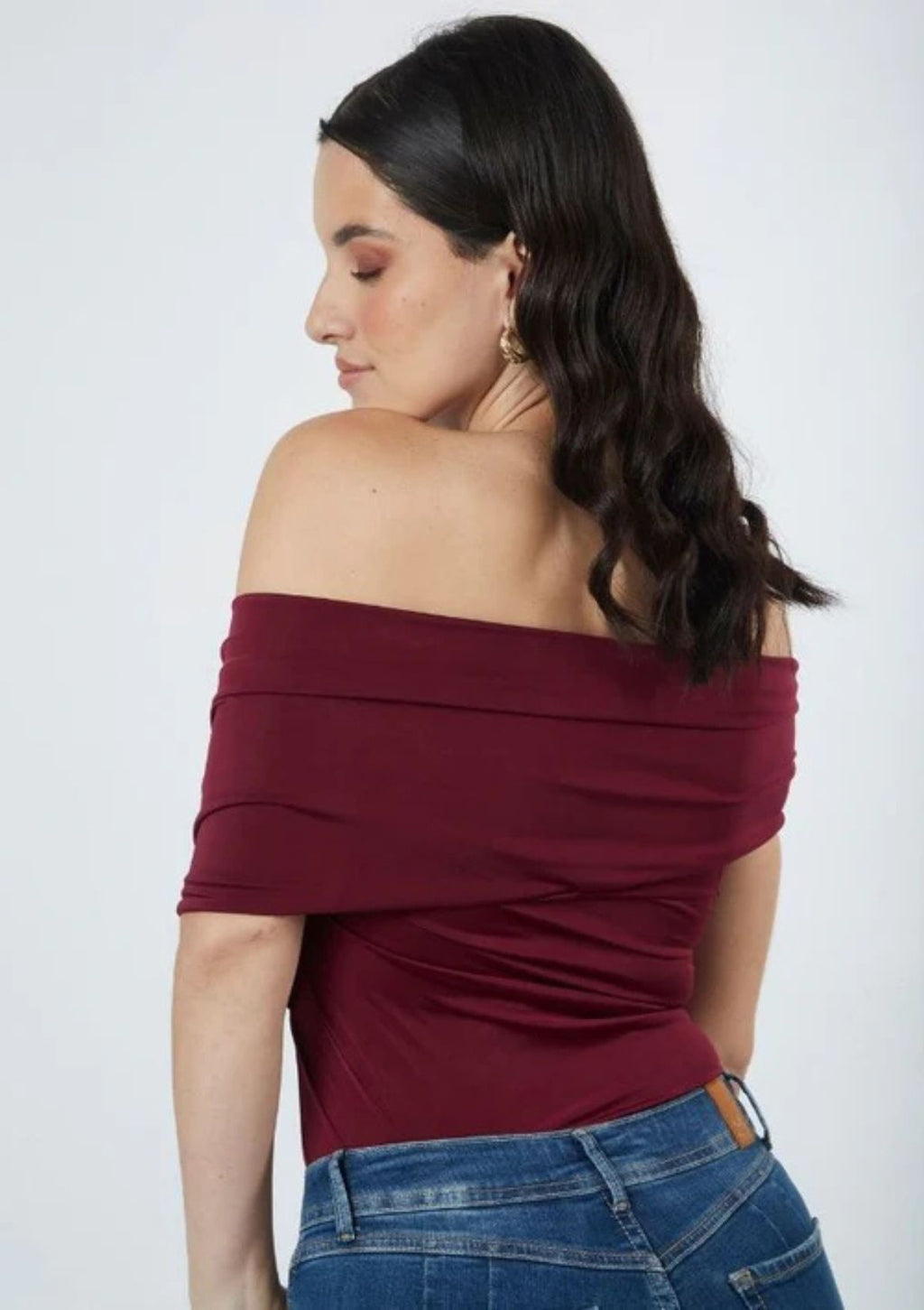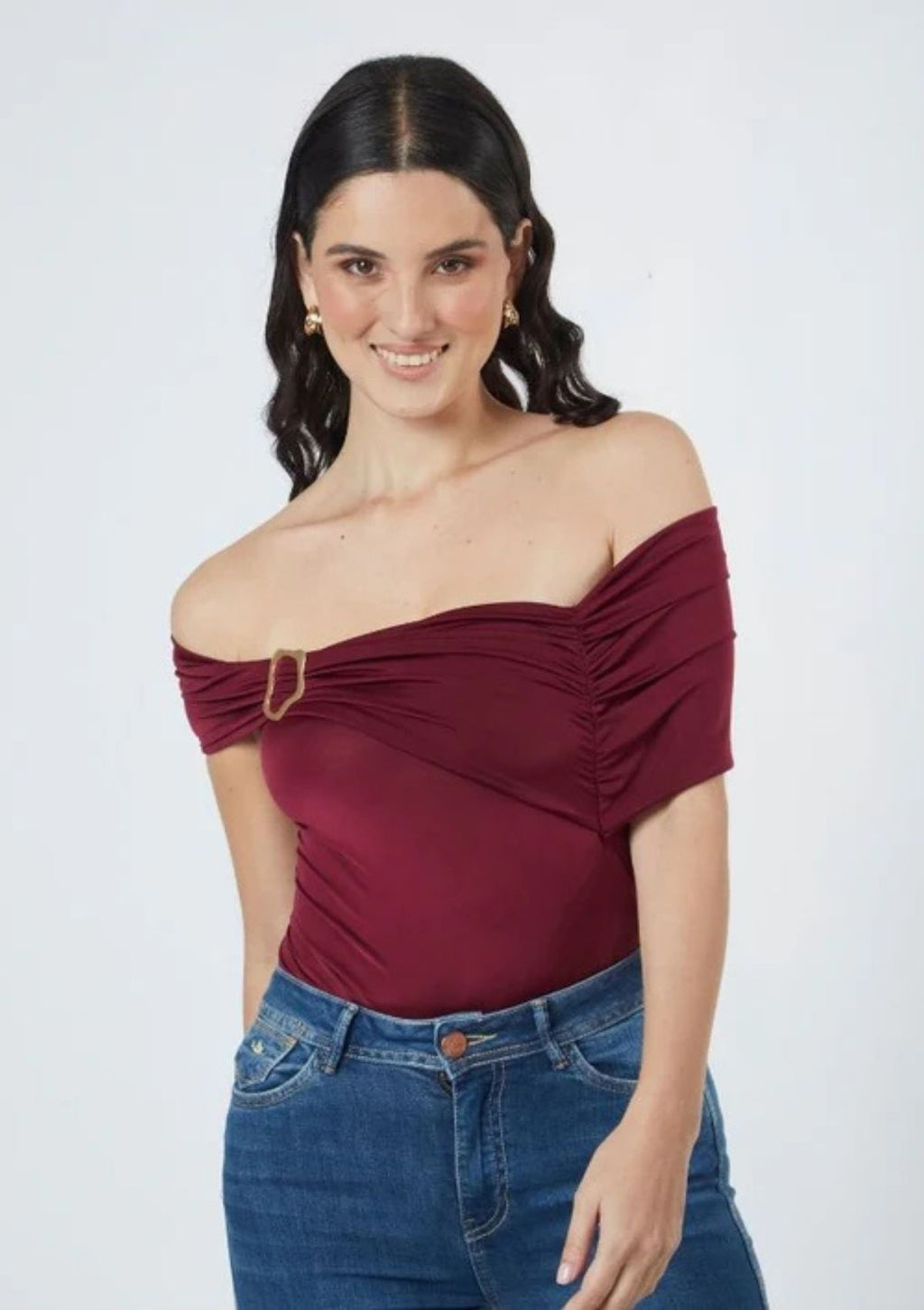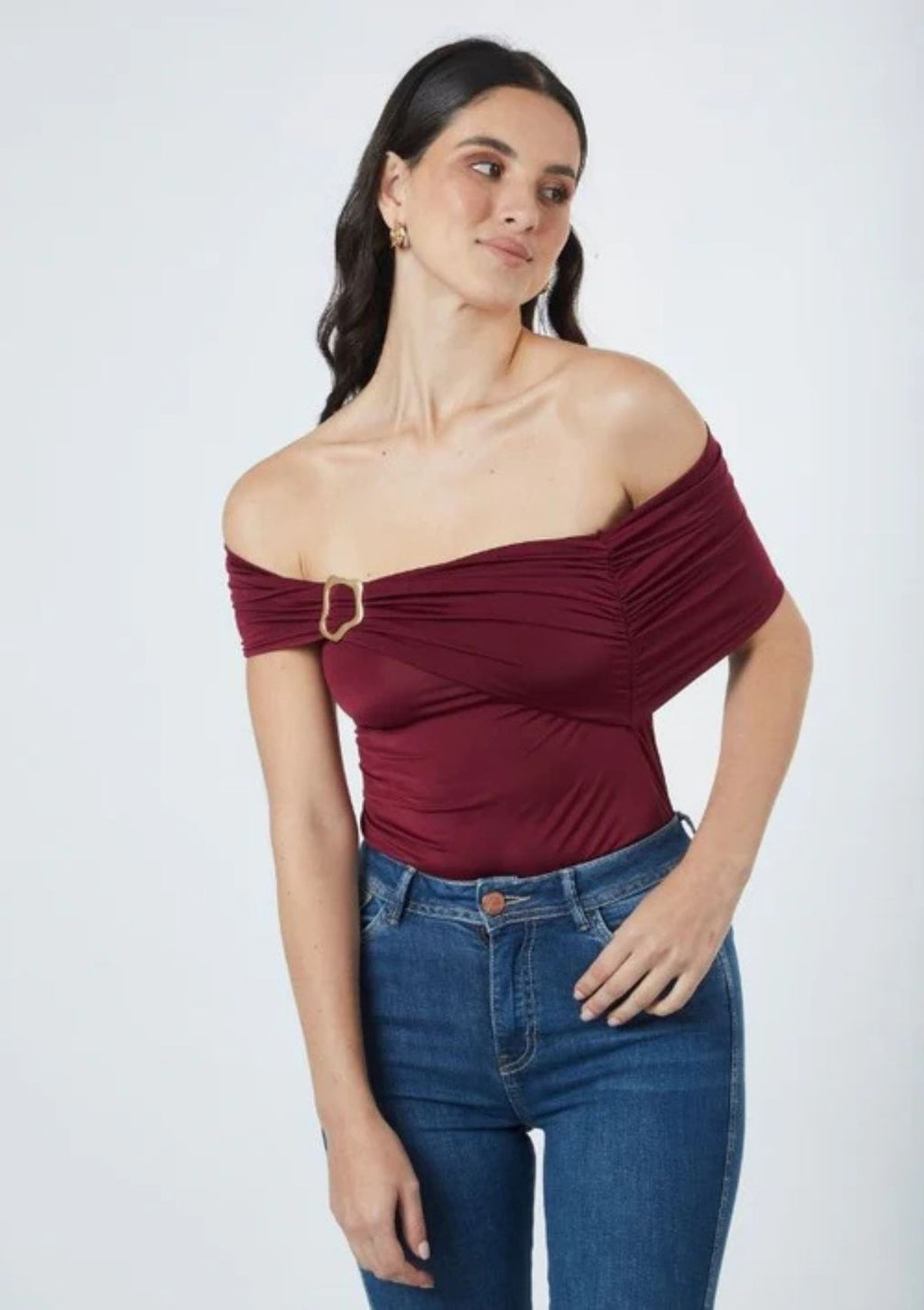 -  Body licrado con pliegues y fruncido en las mangas, detalle de aro dorado en la parte izquierda.