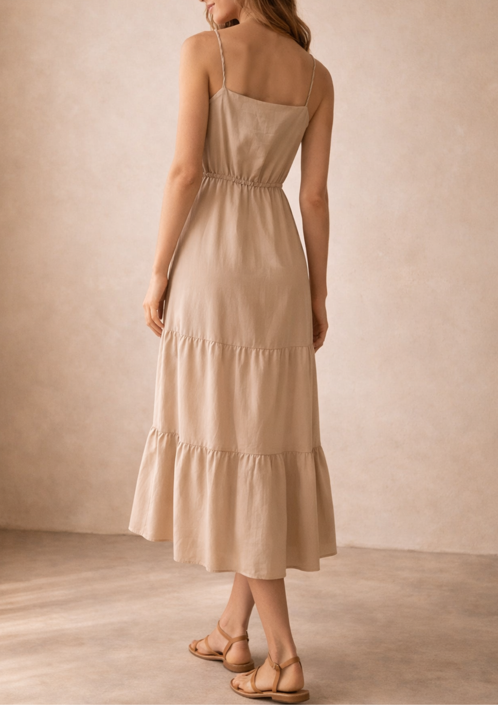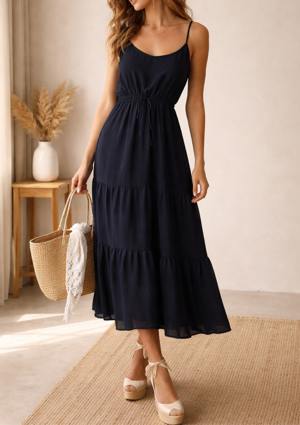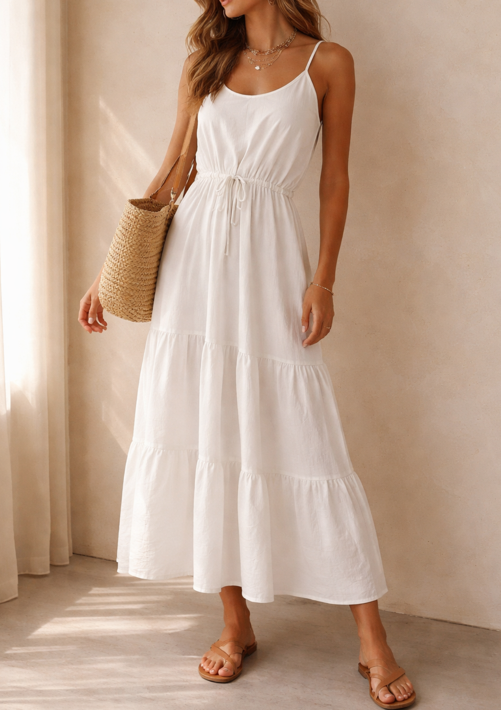 Cuenta con tiras finas regulables y una pita funcional en la cintura que te permite ajustar la prenda a tu medida, definiendo la silueta según tu preferencia. Su tejido ligero lo convierte en la opción perfecta para un paseo al atardecer o un evento casual de día. ¡Una pieza versátil que se adapta a tu ritmo y a tu cuerpo!"