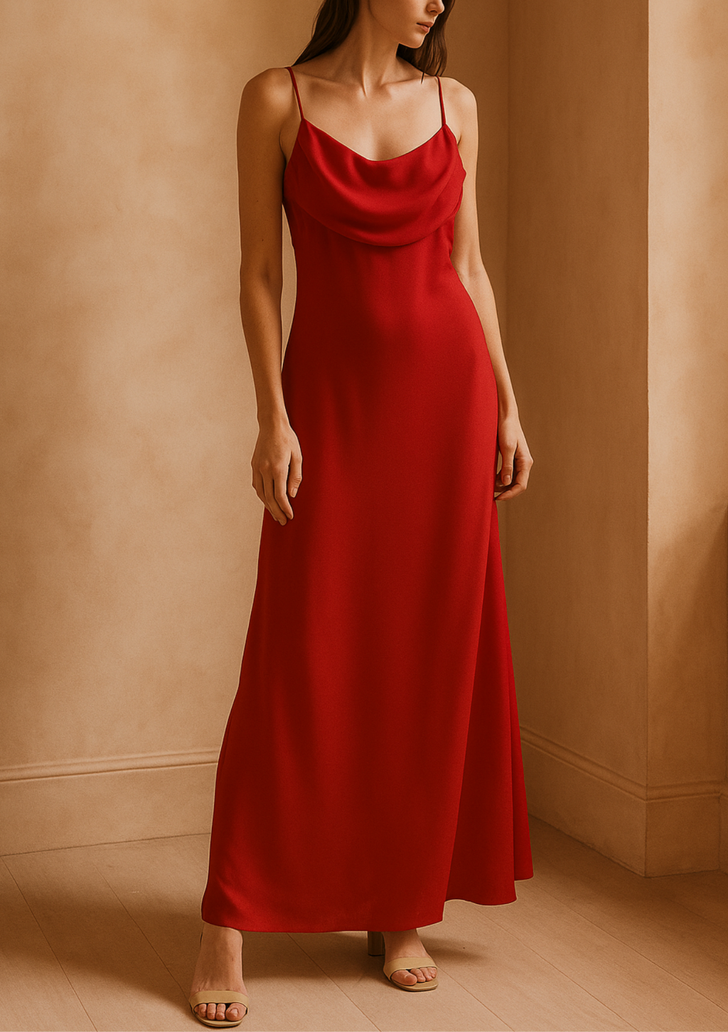 Deslumbra con nuestro vestido largo de gasa. Su diseño con tiras delgadas y un escote cowl (drapeado) en el busto irradia un estilo sensual y atemporal. La silueta recta y fluida ofrece una caída elegante y cómoda.