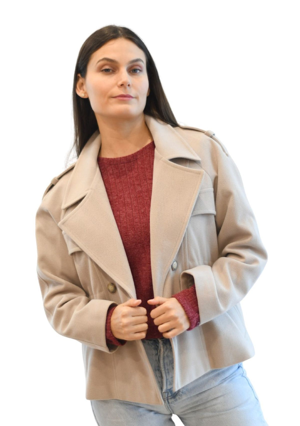 Luce elegante y sofisticada con nuestro saco corto tipo trench en tono beige neutro. Diseñado con solapas anchas, doble botonadura y detalles tipo militar en los hombros, este saco es la combinación perfecta entre lo clásico y lo moderno.