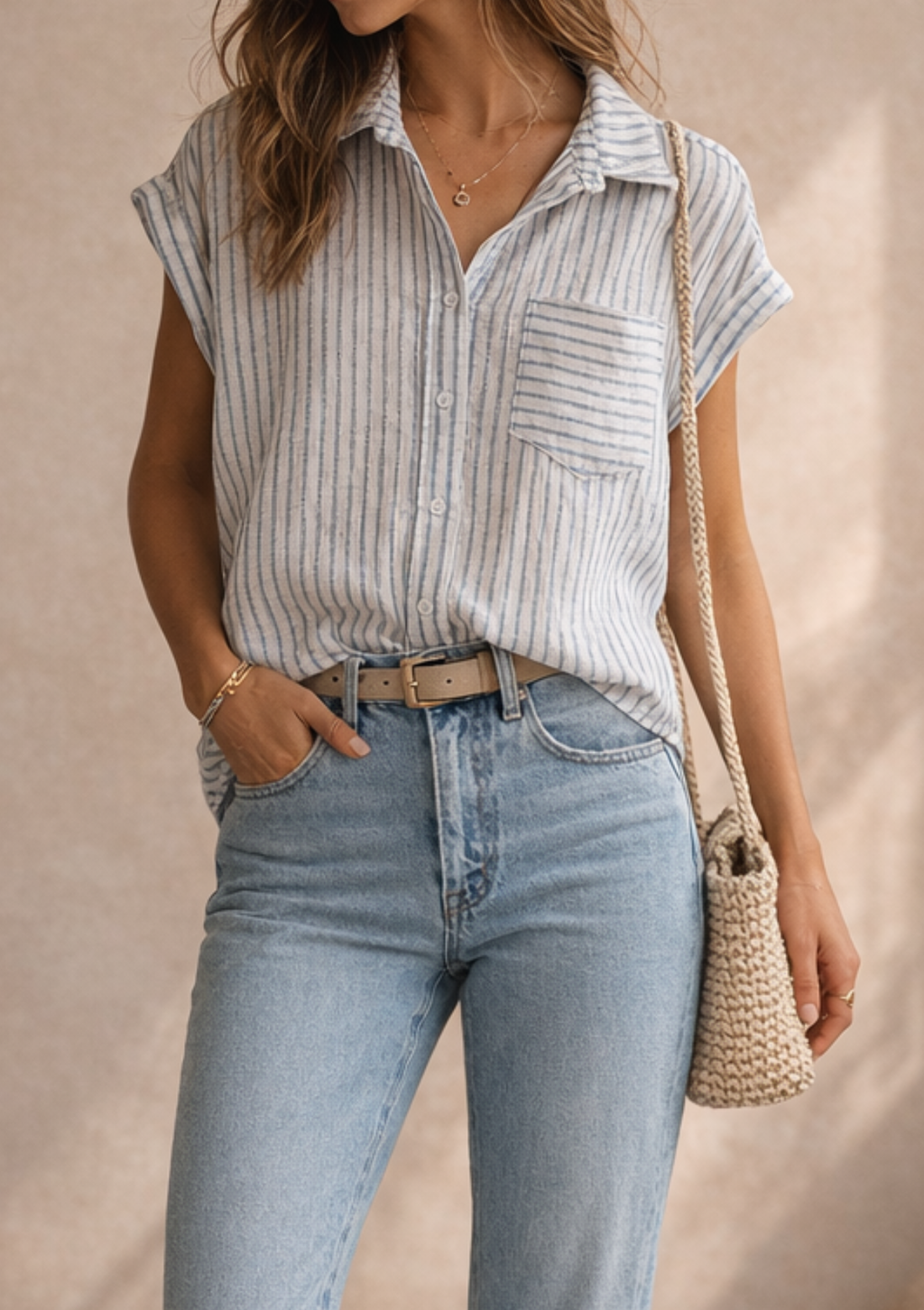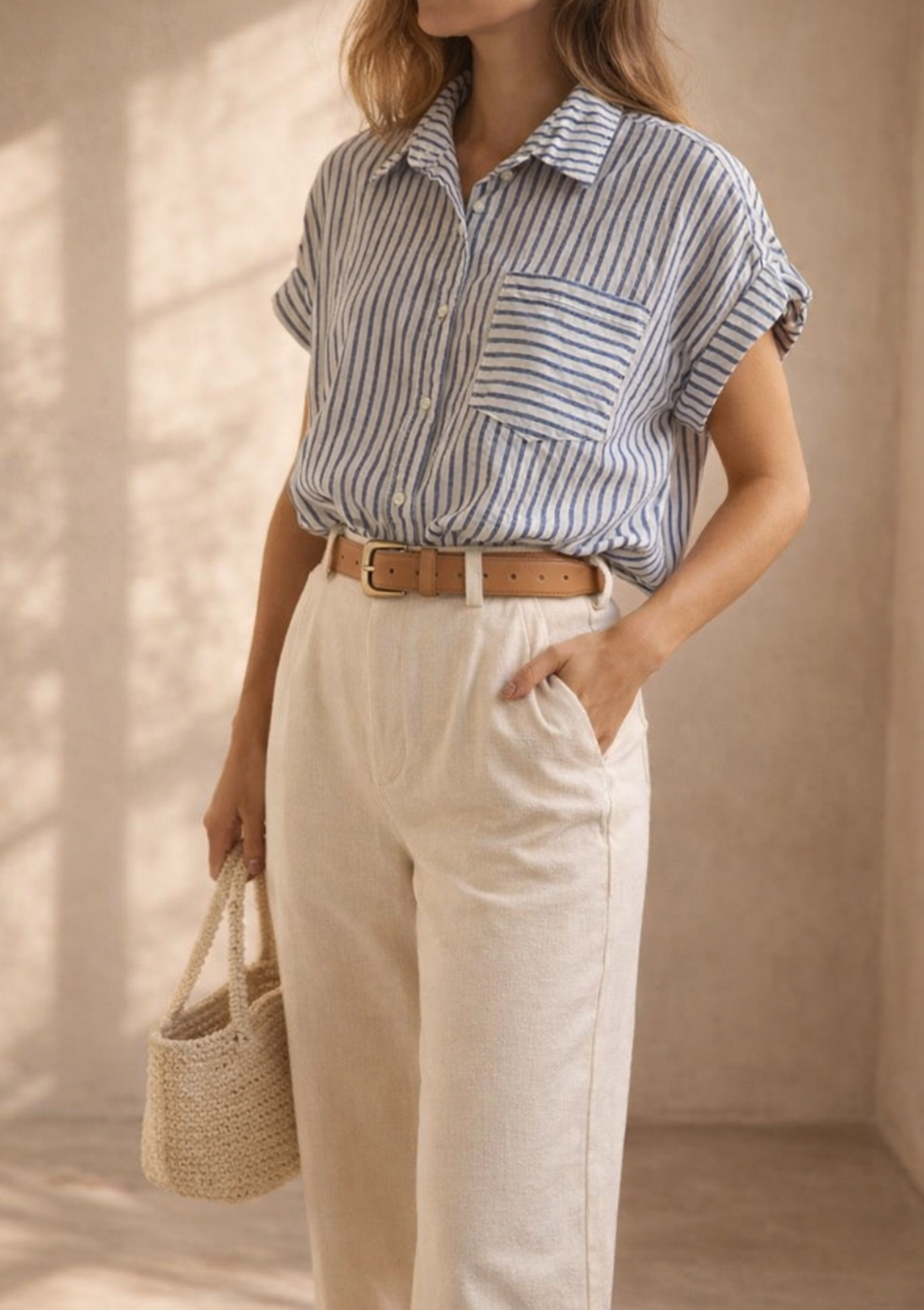 Dale un aire renovado a tu armario con nuestra blusa de rayas. Su diseño presenta un corte relajado con cuello camisero, botones frontales y una práctica bolsillo en el pecho. Las mangas cortas con detalle de doblez aportan un toque casual y moderno.