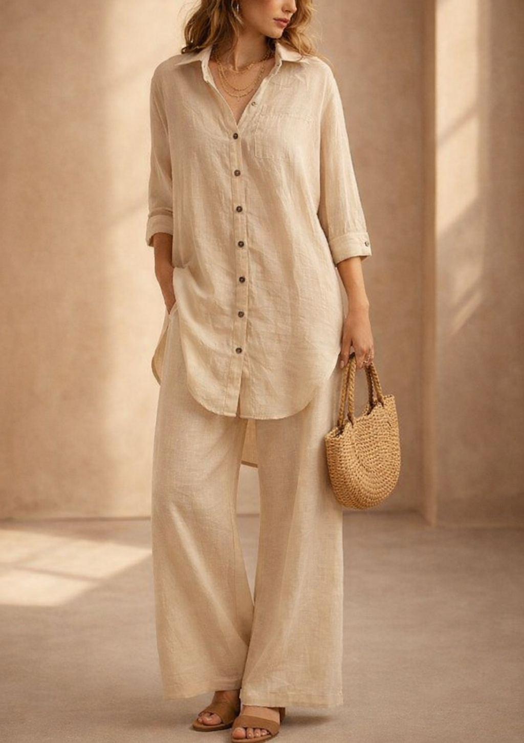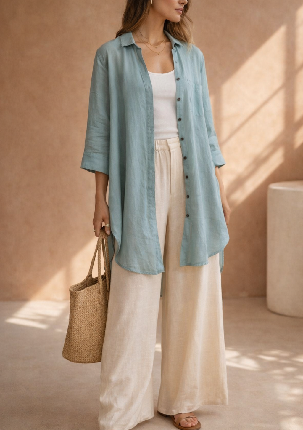 El bajo redondeado y ligeramente más largo en la espalda la hace perfecta para llevar sobre jeans, pantalones anchos o short/falda. ¡Una prenda esencial que combina la textura natural del lino con una comodidad insuperable!
