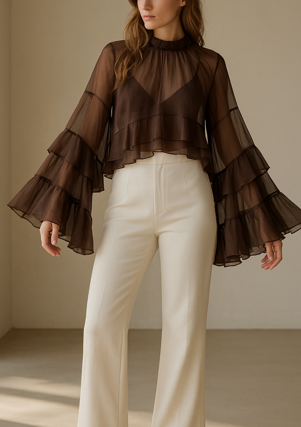 Añade un toque de dramatismo a tu outfit con nuestra blusa de tull transparente en sofisticado color marrón. Su diseño asimétrico es corto en el frente (crop) y más largo en la espalda. Presenta un cuello alto con ruffles y espectaculares mangas de volantes.