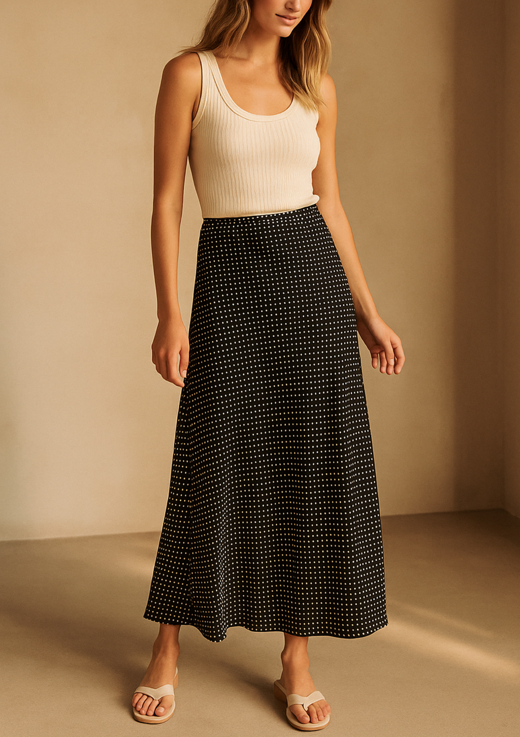 Añade un toque de encanto vintage a tu armario con nuestra falda maxi de satín en un elegante estampado de lunares. Su diseño de corte recto y cintura elasticada ofrece una caída fluida y cómoda.
