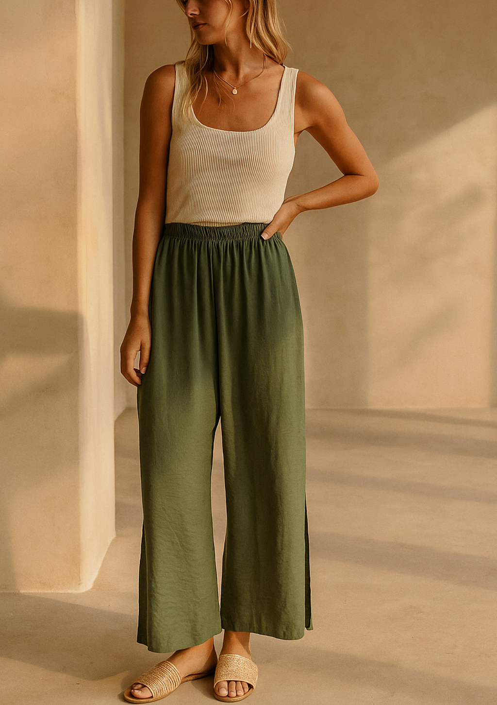 Añade un toque sofisticado a tu armario con nuestro pantalón palazzo de viscosa. Su diseño de cintura totalmente elasticada y corte ancho ofrece una caída fluida y movimiento. El detalle de pequeñas aberturas en la parte baja añade un toque moderno.