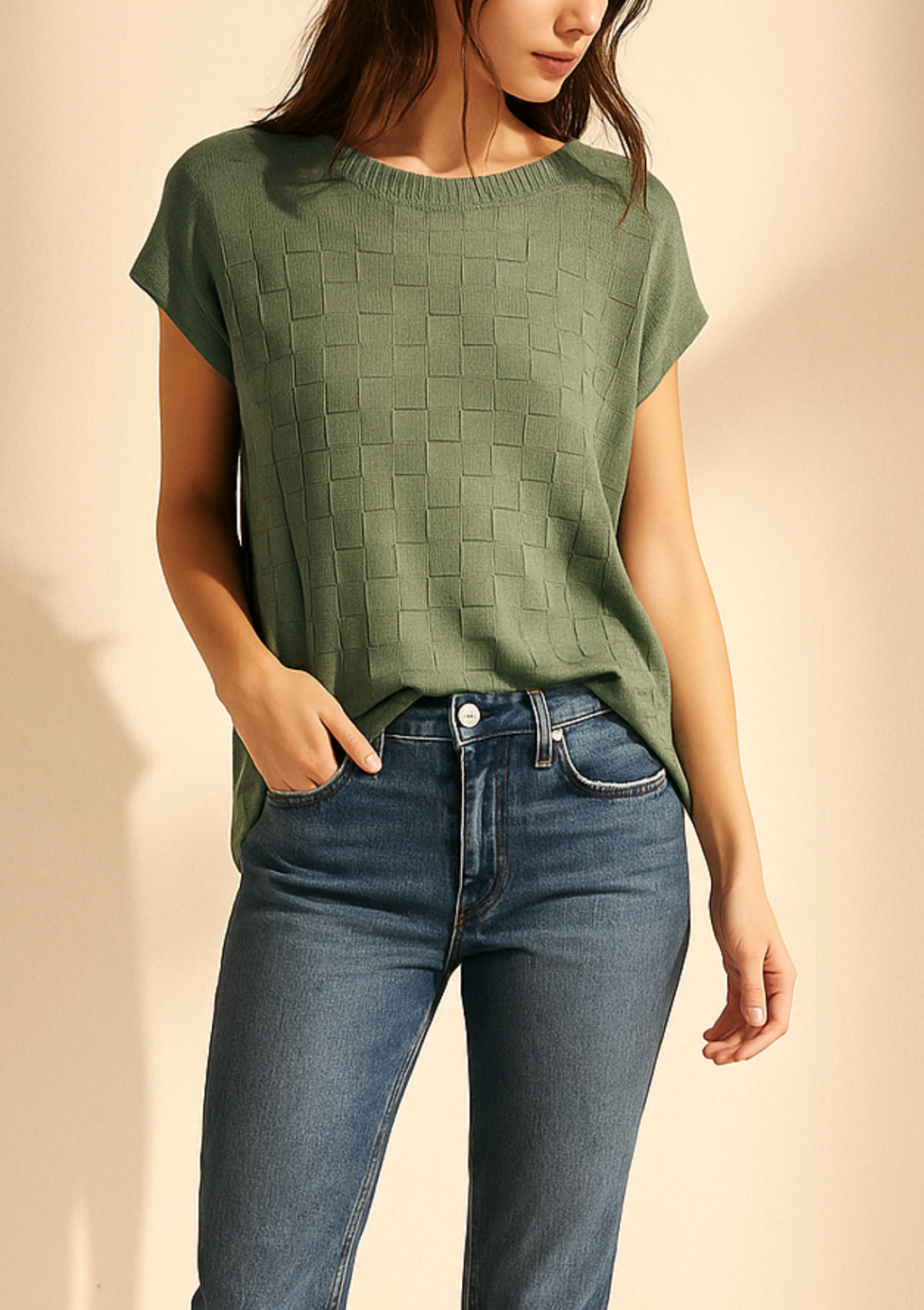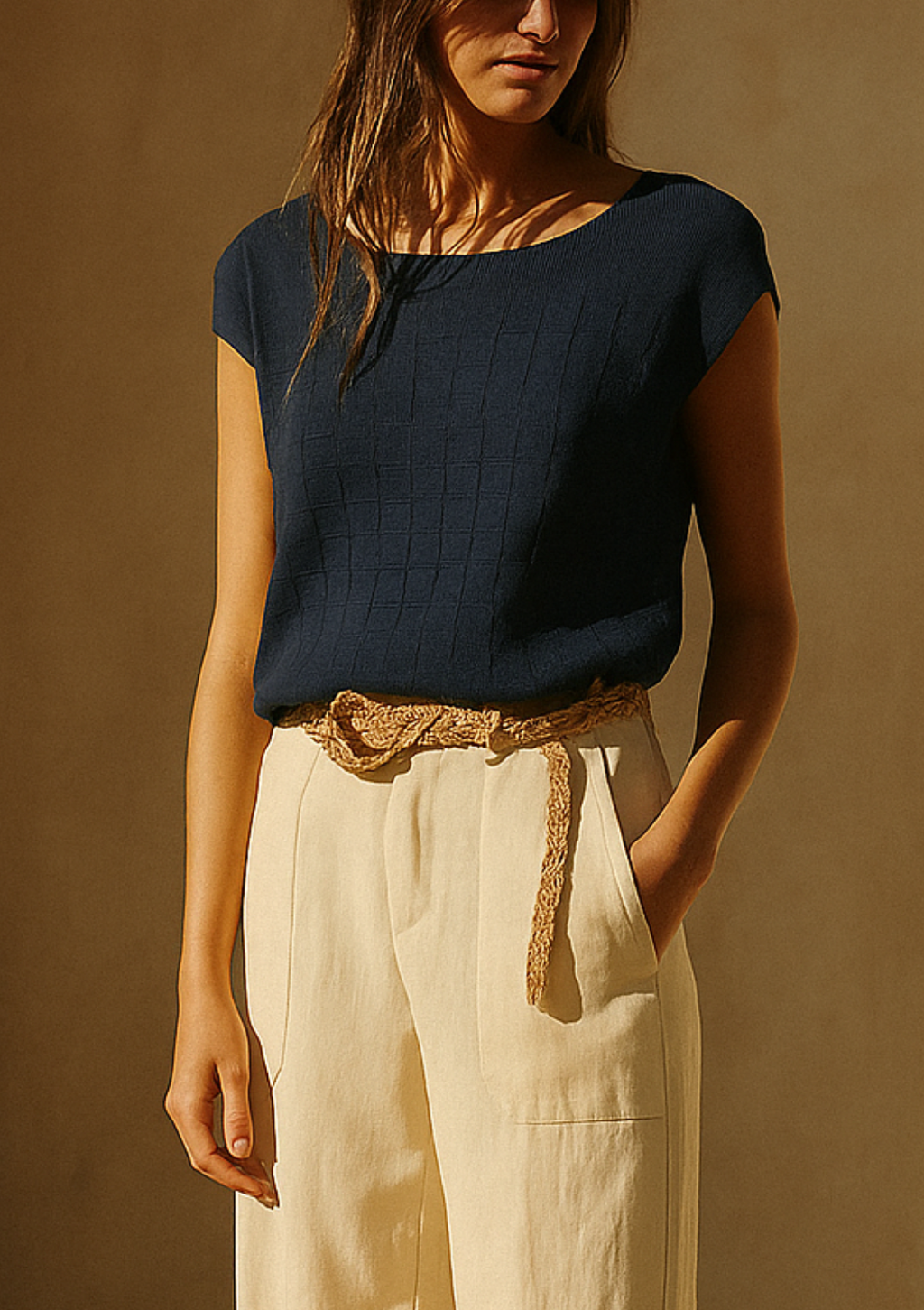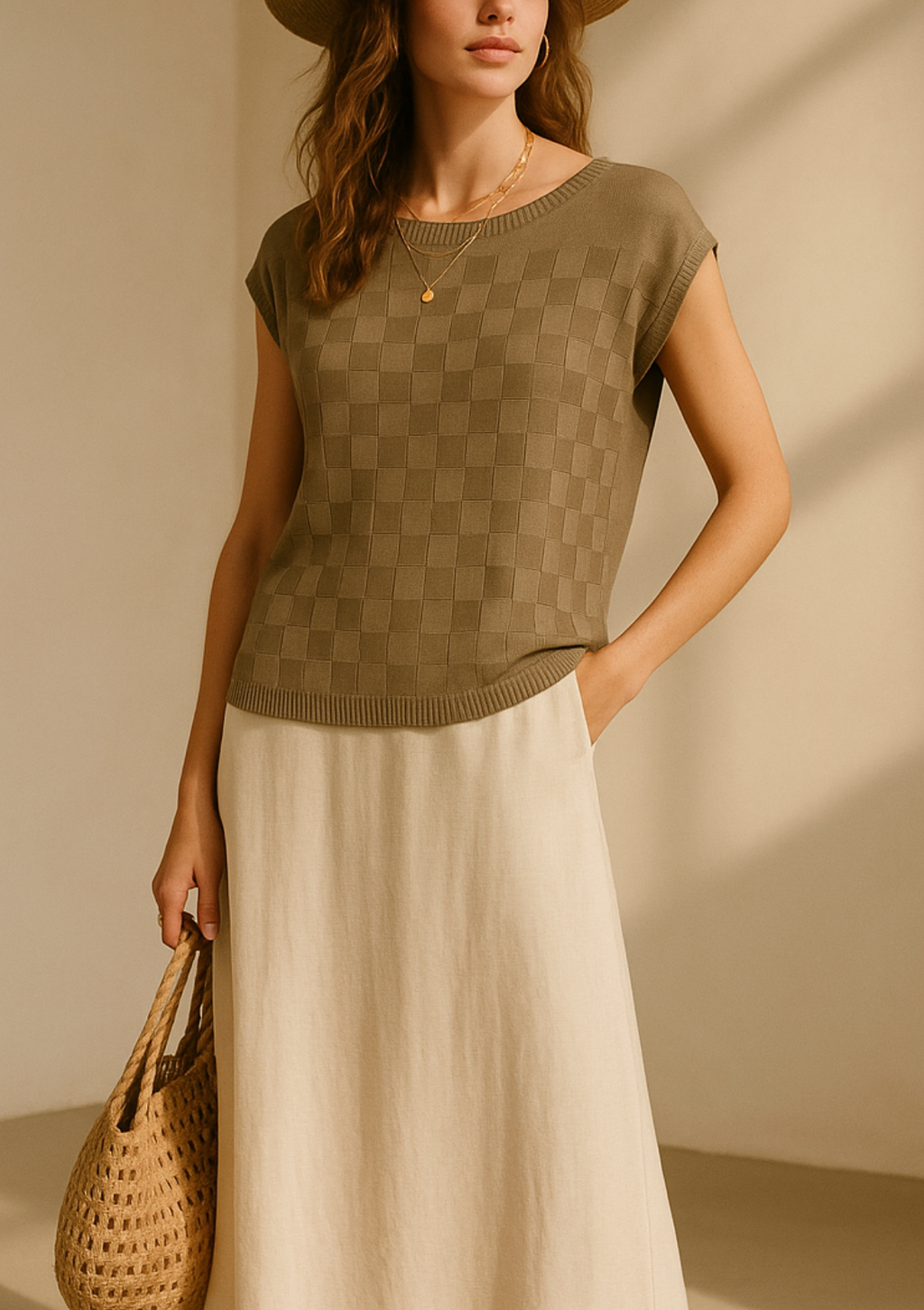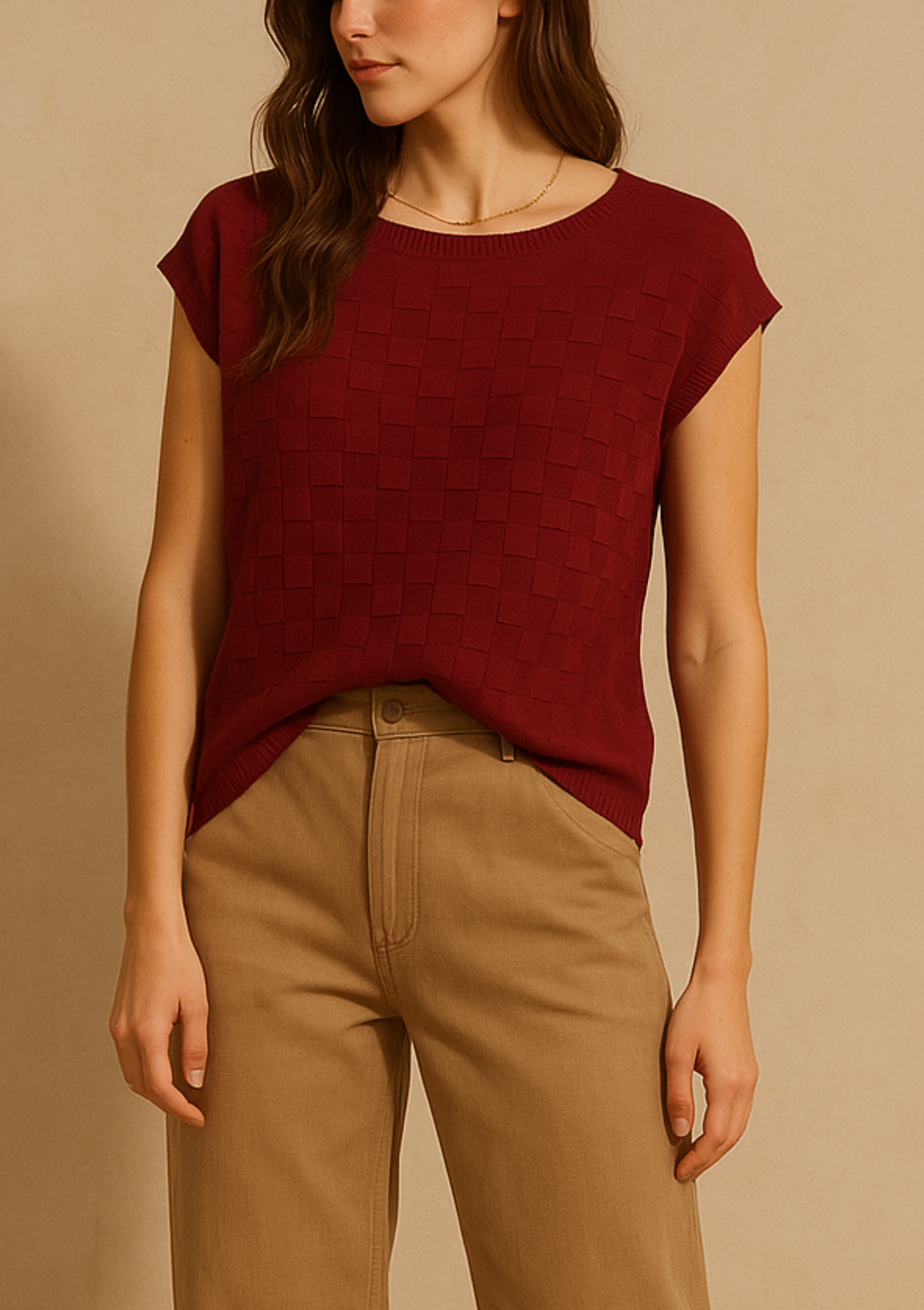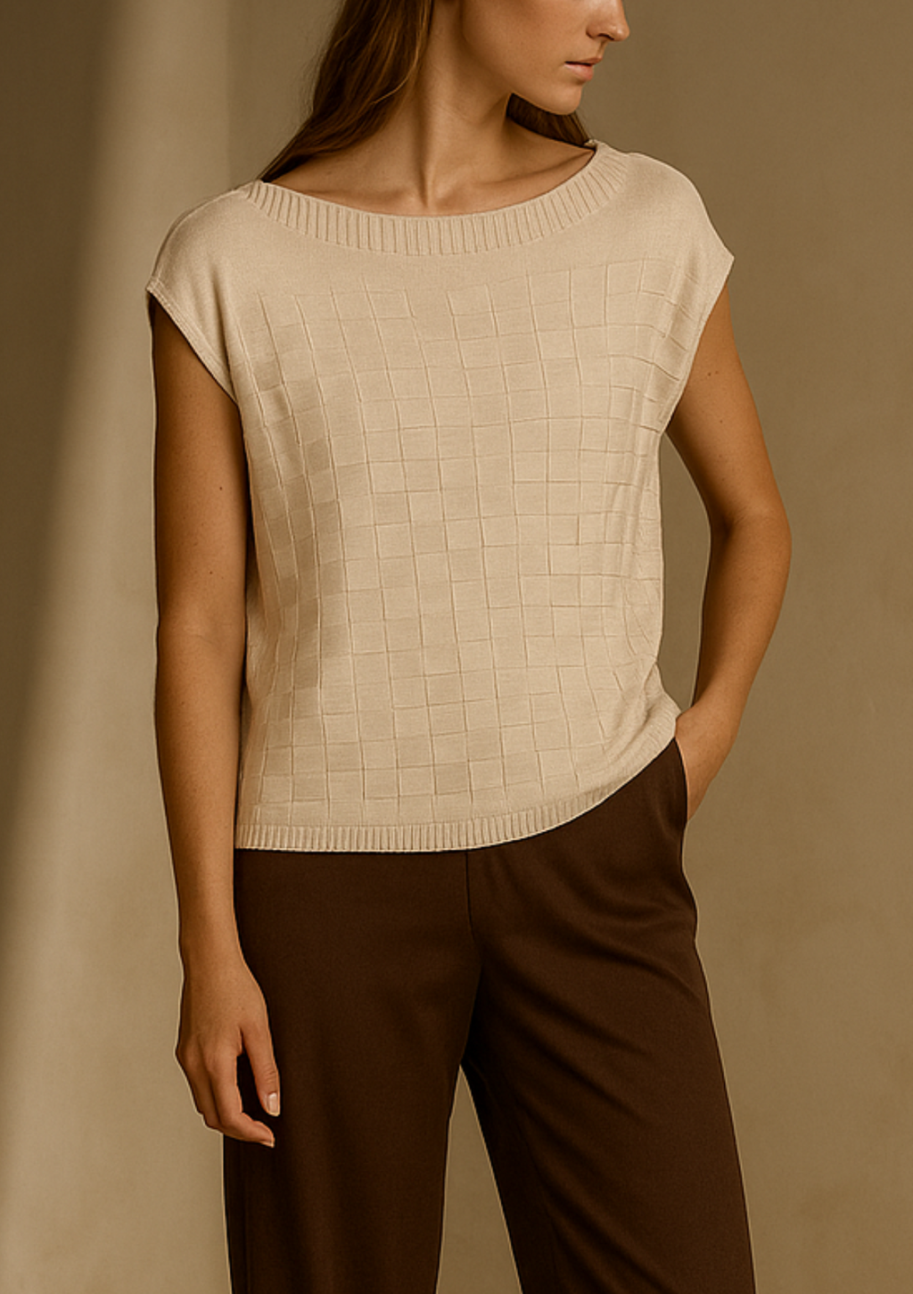 Añade un toque de textura a tu look con nuestro polo tejido de viscosa. Su diseño sin mangas con escote redondo y el sutil patrón de cuadros le confieren un aire moderno y chic.