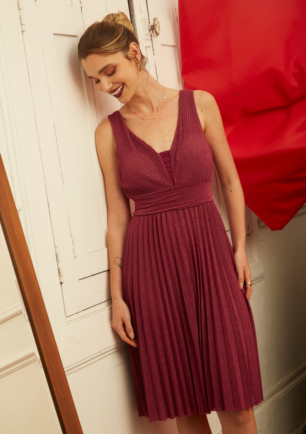 Deslumbra con nuestro vestido mini. Su diseño con escote en V y plisado en el busto define elegantemente la figura. La falda con corte A presenta un plisado completo con brillos que irradia un estilo festivo y con movimiento.