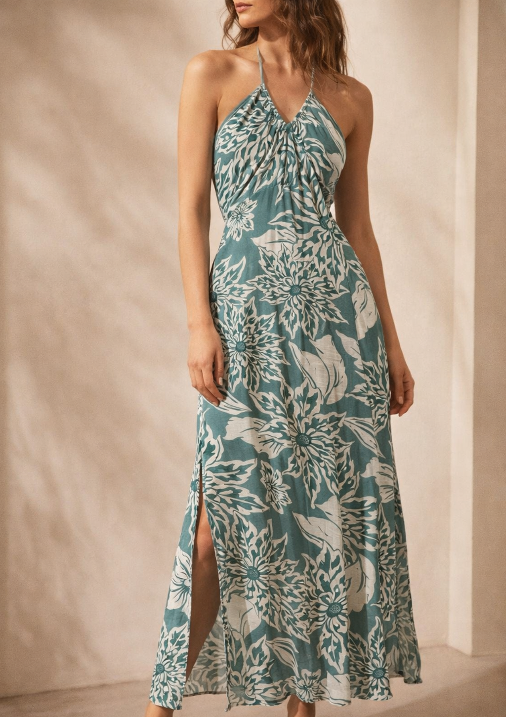 Presenta un favorecedor cuello en V que se transforma en un elegante amarre tipo halter al cuello, dejando los hombros al descubierto.