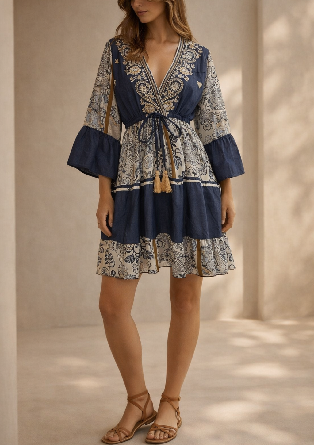 Añade un toque artesanal a tu look con este vestido mini que combina denim con un sofisticado estampado étnico. Su diseño destaca por un favorecedor escote en V cruzado y mangas acampanadas que aportan un aire bohemio y fluido.